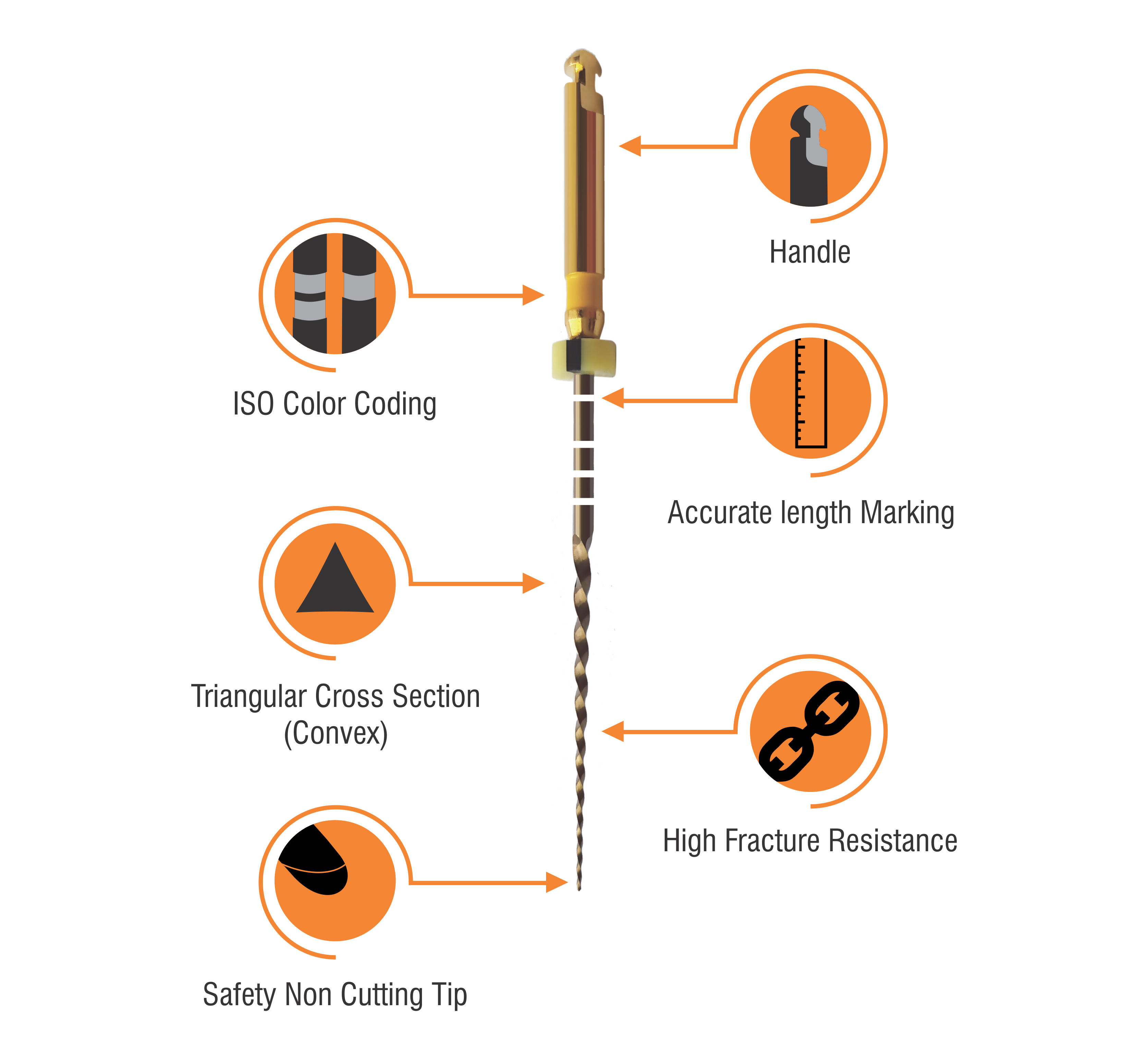Triangular Cross Section – convex triangular cross section. It enhances cutting efficiency and reduces friction between files and dentin